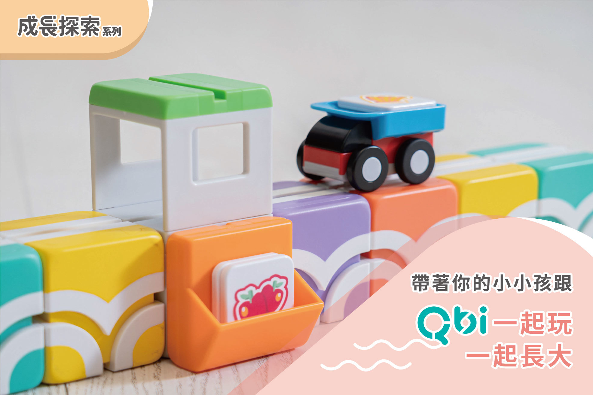 這次Qbi新推出的成長系列-幼幼組,加入了新玩法「迴力小貨車」、「水果貨物卡」及「超級市場」的設計,我們希望孩子在2歲多就能開心地跟著爸媽一起玩Qbi。