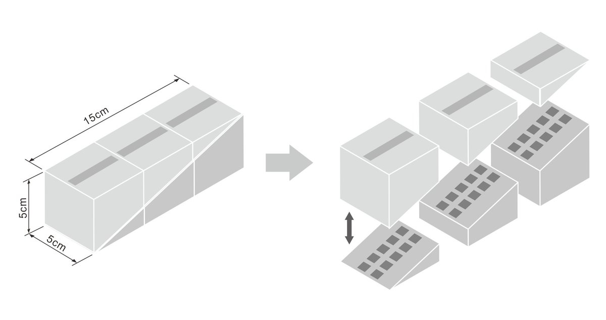 ▲斜坡方塊有三種尺寸,堆疊後等於三個立方體軌道方塊尺寸