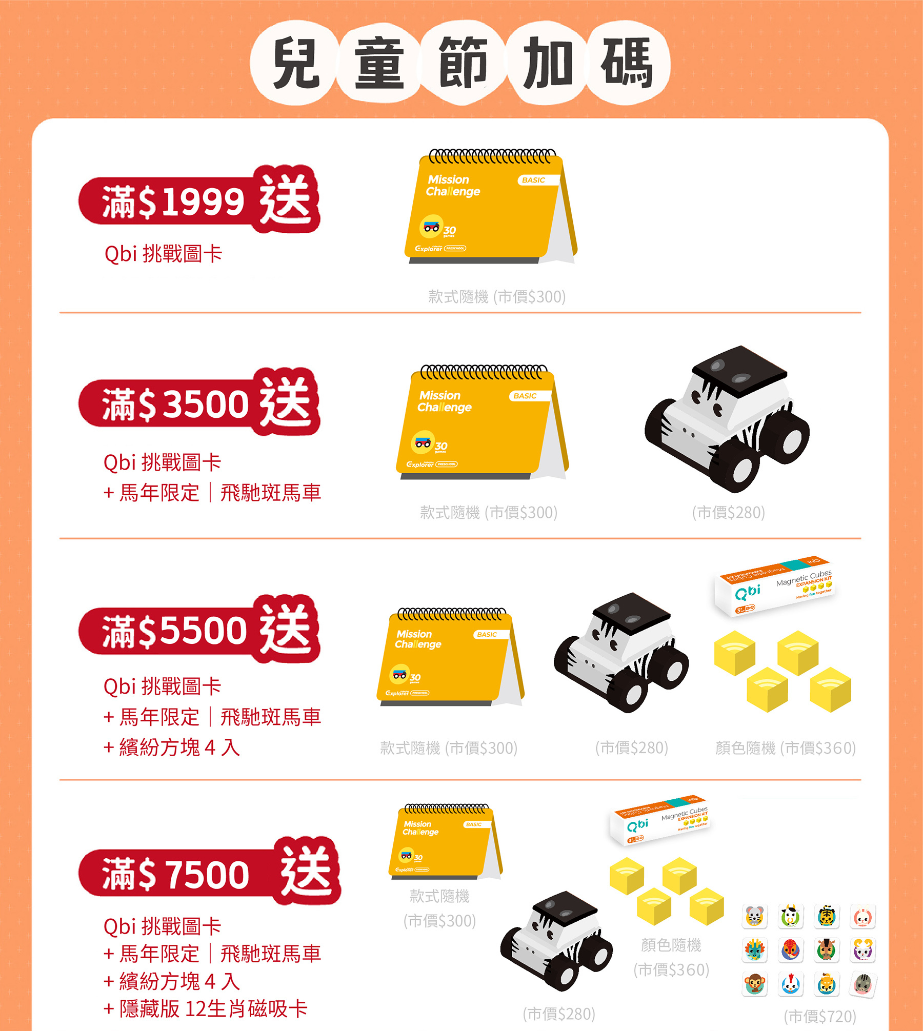※滿額禮說明:單筆訂單滿$8,000,可獲得滿額禮「挑戰圖卡、飛馳斑馬車、繽紛方塊4入、12生肖磁吸卡1套」。