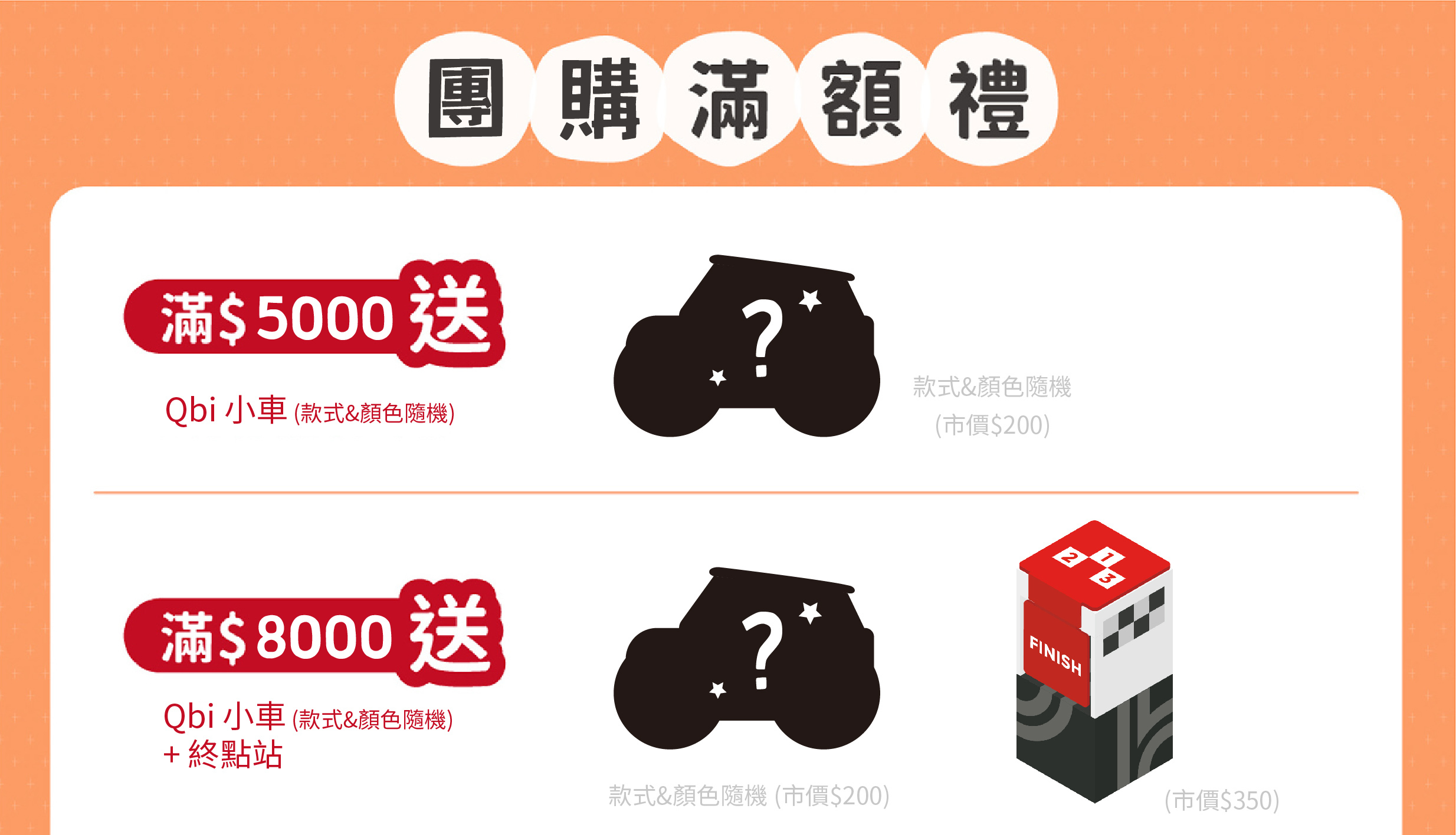 ※滿額禮說明:單筆訂單滿$8,000,可獲得滿額禮「Qbi小車*1、終點站*1 」。