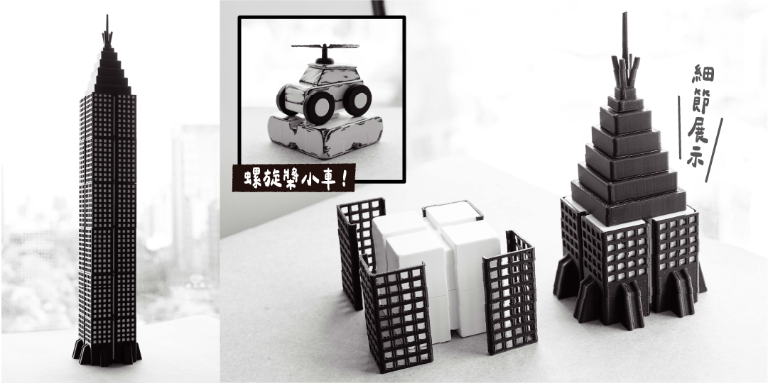 ▌設計理念:一直想把Qbi蓋成大廈,用3D列印出了卡榫套,可以無限長高,最後在最上方蓋了一個經典的屋頂。螺旋槳也是真的會轉,靈感來自多啦A夢漫畫!