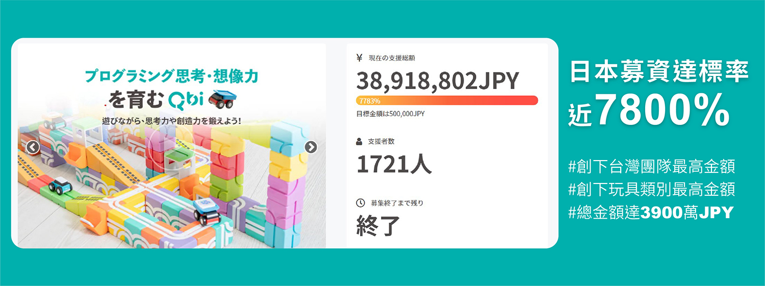 在Campfire的眾多募資專案中,Qbi很榮幸能成為台灣團隊目前的最高金額專案、並同時創下玩具類別的最高金額。
