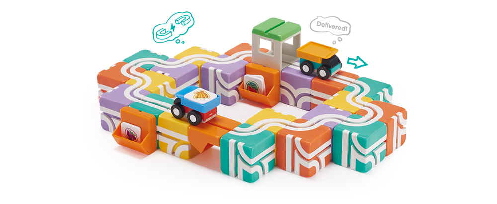 超吸睛的磁吸收货设计,只要小货车载着水果卡通过,超市就会自动收货。小小孩在跟新朋友介绍Qbi时,一定要来一场神奇的魔术秀。