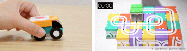 ▲ 将小车后轮着地往前推,再将前轮的导杆放入轨道,就可以让玩具车冲向停车库;停车库里面也有强力磁铁,可以跟方块紧紧连接