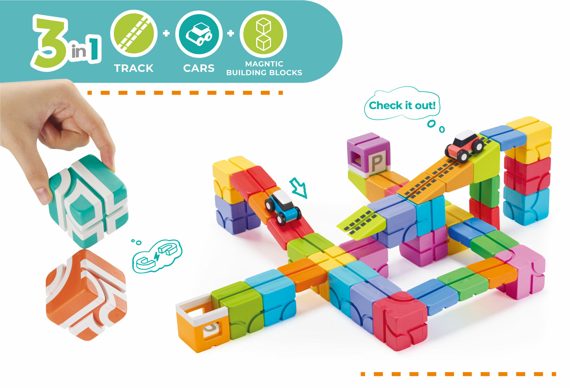全新弹跳桥更有挑战性,能组出千变万化的轨道!缤纷方块磁力更强,适合直向串接,能满足轨道延伸的扩充需求。