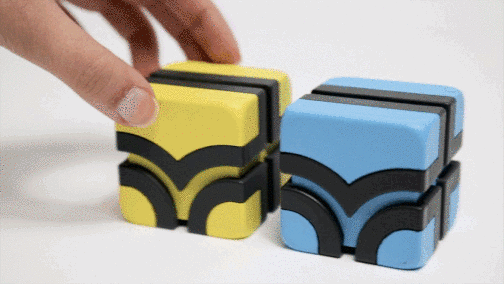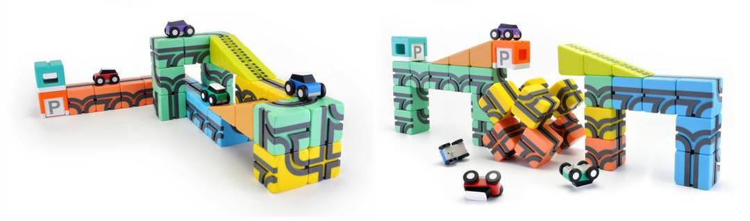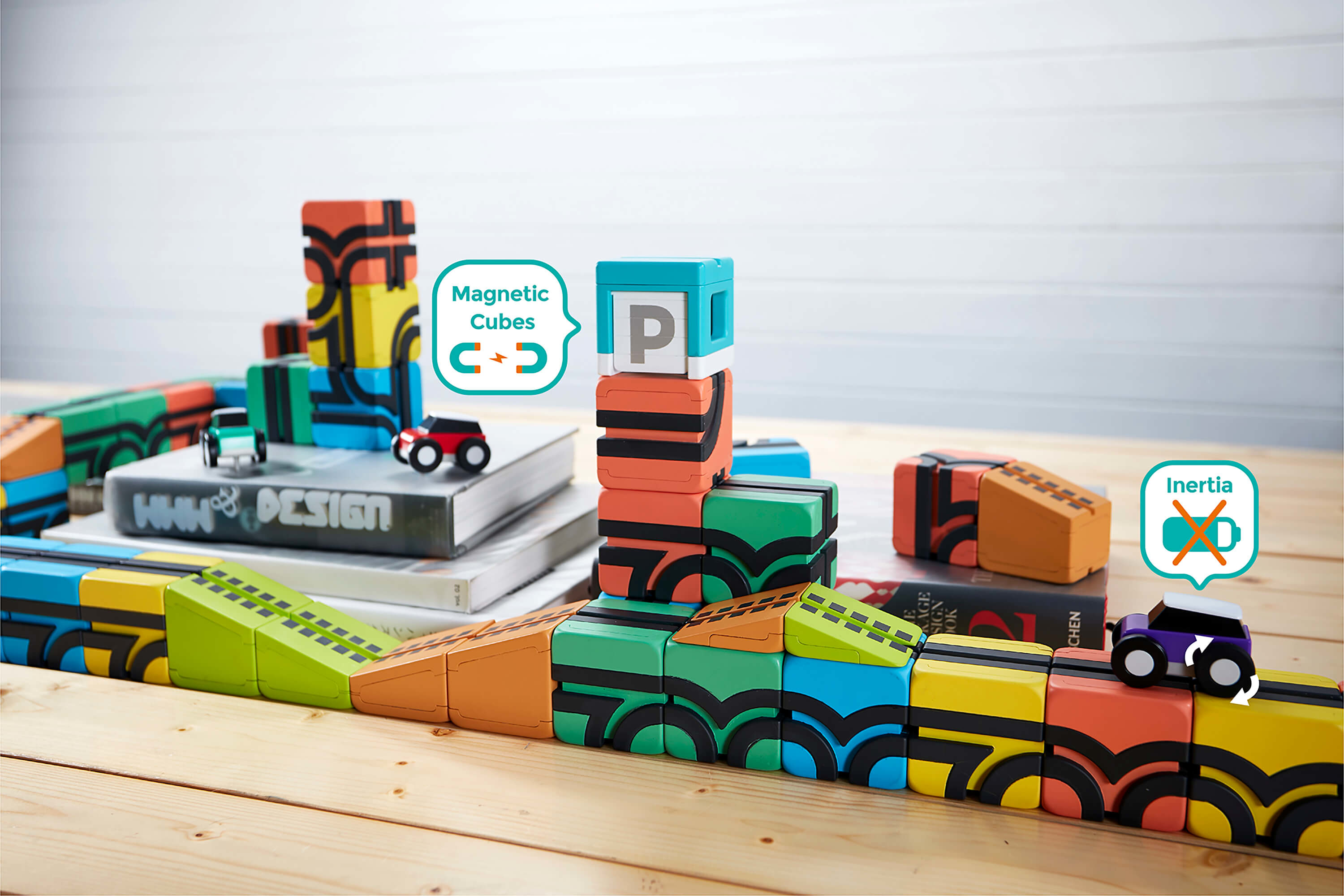 方塊的六個面各為不同軌道造型,可依照喜好自行拼接軌道,初期建議從平面開始組接軌道,進階可使用直角三角形斜坡組可以製造坡度變化,打造立體軌道。